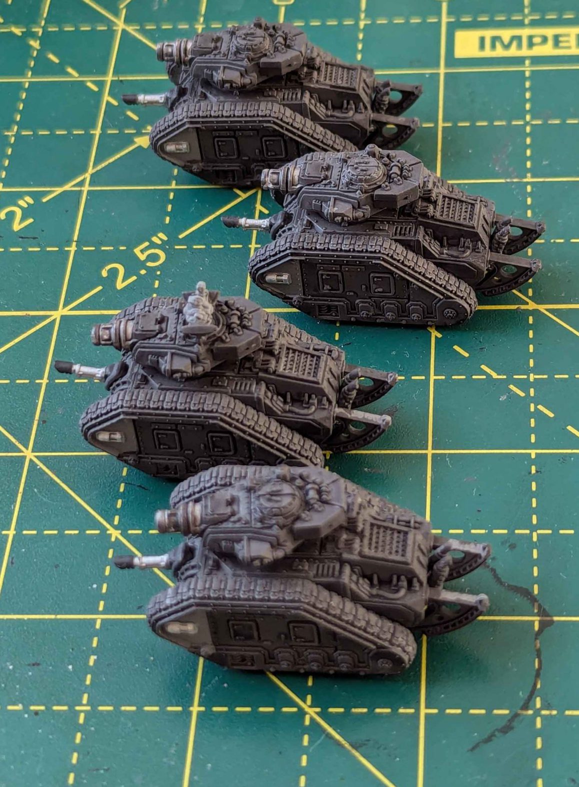 Leman Russ Demolishers with Basilicanum Grey applied - Credit Thundercloud.Contrast gets pushed hard as something to apply over a white or off-white undercoat, but with underpainting there are actually a range of colours that you paint over (and contrast is made for underpainting). A mid-grey with a darker grey like Basilicanum Grey gives a well defined battlefield grey tone.