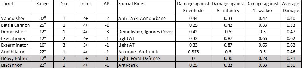 Here’s a table of the damage outputs of the different Russ turrets (the secondary lascannon/heavy bolter are coloured grey so you can see what they add).