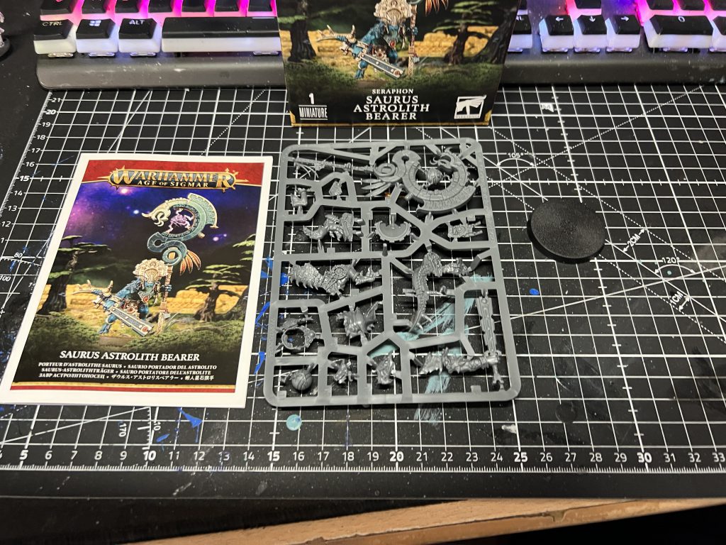Liam: Rounding out the trio of kits I built for this, there's the Skink Starseer on his tiny little version of the Slann's palanquin. The most surprising thing here is that there are two completely different Skinks you can build - one seated and contemplating his iPhone, and another stood up and casting. They're completely separate and you could plausibly build a second Skink Priest out of whichever you don't use (probably easier with the standing one).In a reversal from the Scar-Veteran, this one feels like there's a lot of pieces just to build a single Skink and his rock. This is partly because of the sacred plaques around the edges and partly because there's some small details to attach on - leaves, vines, roots, you know the kind of thing. It all cleans up fast though and the build flows really nicely once you get into it - you'll have your own texting Starseer in no time.