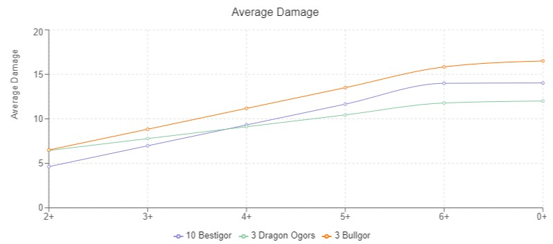 Damage on the charge across our Elite Hammer choices.On the charge, these three units deal relatively similar damage, and are costed roughly the same. That said, their relative toughness is essentially inverted, with Bestigor on top, then Dragon Ogors, then Bullgor. If you’re looking for a missile unit, Bullgors still remain the best hammer, although far less concentrated in their damage compared to third edition. If you want a more defensive hammer, Bestigors pull ahead, being a dense pile of 4+ saves that still deals respectable damage. If you’re looking for somewhere in the middle, Dragon Ogors are the premier piece, especially given 3-model Dragon Ogor units are, as stated, the highest single-efficiency resurrection with Brayblast Trumpet in the army.