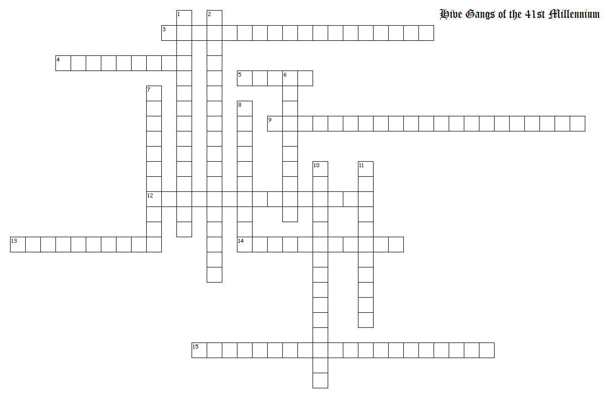 Across 3. Order must be upheld in the imperium, even in the underhive. These local law enforcers uphold that order. (2 words) 4. These members are often easily recognized due to their punitive stature compared to the other members of the gang (2 words) 5. Originally designed for excavation, these heavy constructs are often retooled as weapons by gangs (1 word) 9. This cult feasts on the flesh of the fallen and worship the Lord of Skin and Sinew (4 words) 12. Though short in stature he may be, this hired gun has no problem utilizing his hammer to solve problems (2 words) 13. Scraping an existence from the scraps of others, this fanatical gang also has an obsession with fire (2 words) 14. Muscular brutes that love to flaunt their immense strength whenever they can (2 words) 15. When things get too rowdy for regular officers, these heavily armored units are sent in to assist (2 words) Down 1. This hired gun is best used to supply ammo to your forces (2 words) 2. Bounty hunting duo that are famous for swashbuckling adventures (4 words) 6. Gang based out of ferrous slag pits (2 words) 7. 8. This gang utilizes expertise in pharmaceuticals and chemicals. Also have a ton of flair. (2 words) 10. These established members utilize enhancement drugs to reach peak muscularity, often becoming addicted to them (2 words) 11. The most technologically advanced and wealthy of the gangs (3 words)