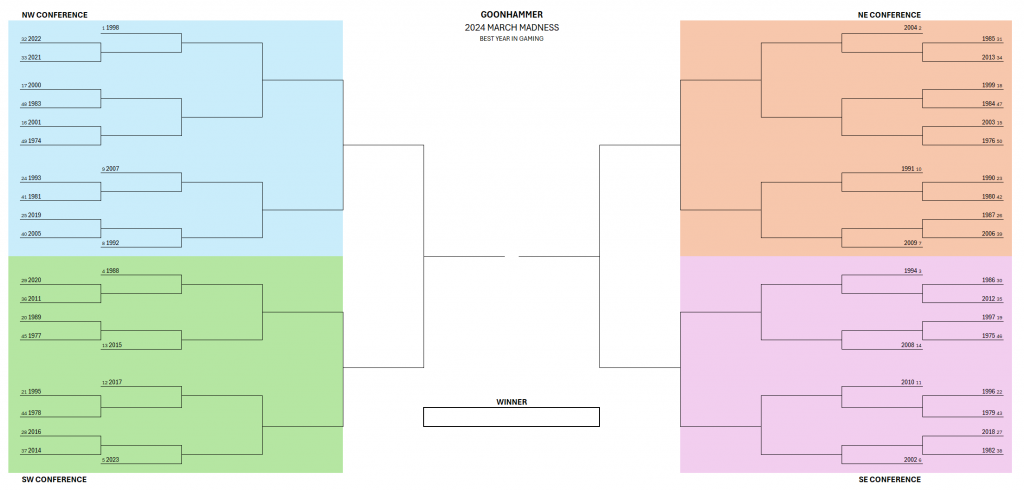 After a stellar 2023 in games we decided to celebrate March Madness 2024 with a tournament to determine the greatest year in gaming history, going back to 1974, the year Dungeons & Dragons was first published. A ton of research went into this project, and we've collected those articles together in one place here.