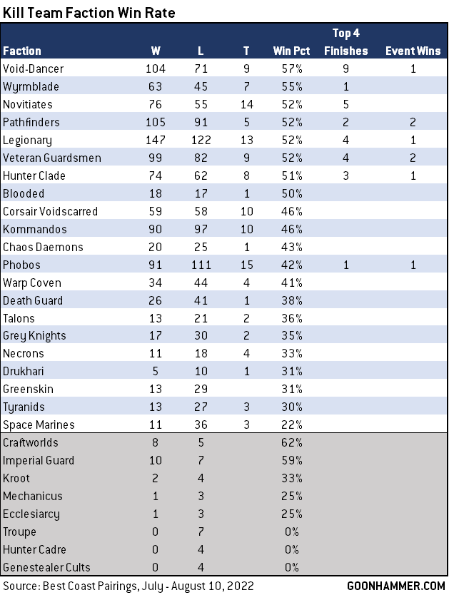 Void-Dancer Troupes are the clear stand-out here, but they've only got a 57% win rate and it's likely that it'd only take some slight tweaks to bring them more in line with the rest of the field (the challenge is less that their win rate is high and more that they're insanely consistent and dominating podium finishes). Even so the bulk of the field is doing well, and the lowest non-Compendium team of the bunch current are Warp Coven kill teams, which at 41% win rates aren't too far off from being competitive. If we had to put these into tiers, they'd likely fall out like this:Tier 1: Top Competitors
