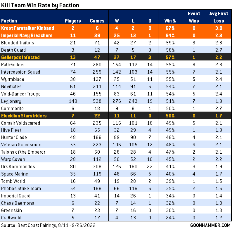 On that note, it's pretty easy to see that there's a relatively strong level of balance among the game's teams, especially those who aren't dependent on Compendium rules. The worst among them are currently the Phobos Strike Team and Warp Coven teams, though those both received small buffs in this week's Kill Team Q3 Dataslate update, which should help them compete more. Otherwise the majority of the game's factions appear to be sitting between a 45% and 55% win rate, which is relatively ideal. Hopefully we'll see that band narrow with the changes from the dataslate. Blooded are worth keeping an eye on as well, but it's not yet clear whether that's just a result of small sample sizes.The meta has been pretty dynamic