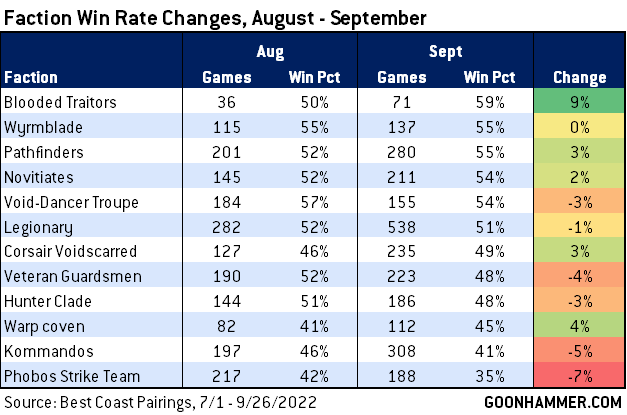 - Blooded Traitors improved the most from their July-August showing, jumping to a 59% win rate with three tournament wins. Not the most by any stretch, but an impressive showing on a relatively small sample of games - only 71 total.