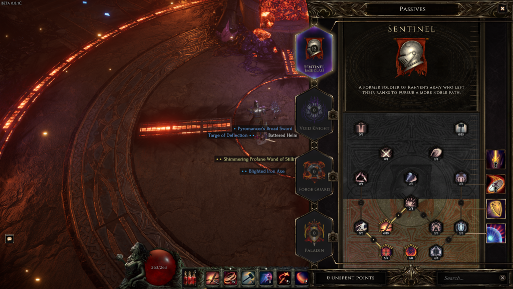 Highlighted is an example of a specialization node that changes how the skill plays: Big Boy Skeletons.You get access to whatever skills you are entitled to given your character level and specialization progression in the passive trees at all times, but only a certain number of skills can be specialized -- you unlock up to five slots as you level up, and you can see that the final slot here is only available once you reach endgame potential. This dovetails nicely with the game deciding that they don’t want to incentivize hotkey set hotswapping; you’ll have a skill on right mouse button, four skills on your Q W E and R, and that’s basically your build. If you want you can set up swapping, but it will be for basic versions of other skills you have access to -- these five will be your mains. Meanwhile, you have access to the passive tree to build your character as below, gaining points to slot into the progressions as you gain levels and complete quests (for which passive skill points are a reward). On the right side of the progression chart, there are skills that are either locked or unlocked depending on your progress up the tree; this is one of the primary tactical concerns of using your passive points besides just buffing the strongest parts of your build. Passive points are gained permanently and can be trivially reallocated with a gold-spend-per-point system; skill specialization points are a function of earned XP, and when they’re removed, they disappear for good (until you kill enough enemies to earn them back).