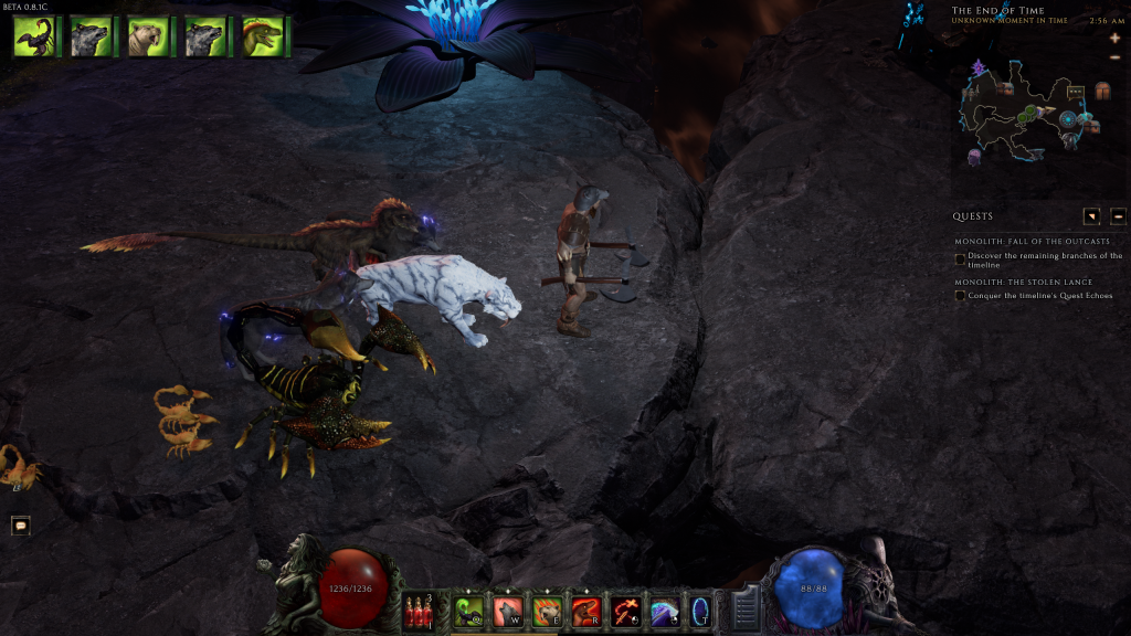 I’m about a third of the way there since Christmas, having seen all the story content with each of the five playable character classes and scratched the surface of the procedurally-generated endgame content. At launch, Last Epoch had four character classes, rather wisely choosing the more beloved archetypes from genre progenitor Diablo II and going from there: the Mage (self-explanatory), the Acolyte (Necromancer), the Primalist (Druid), and the Sentinel (Paladin). Eventually they’d add the Rogue (Assassin) later on in Early Access. Each of those classes has three mastery classes -- though not all of these are in the game yet for every class -- which generally specialize the character into a summoner or an alpha striking tank or a trap-layer, so on and so forth. It’s a rather standard design conceit by now, and the story elements of the game, which involve time-travelling through the apocalypse of a doomed peninsula (which might be the whole of its fantasy world) are...skippable. That’s fine. Not even Path of Exile has a story that stands up to much scrutiny; ARPGs get by on aesthetics and vibes, not plot complexity or moving characterization. After all it’s kind of difficult to get that stuff in the game when your only means of interacting with the world is slaughtering everything on a given map. In this respect, Last Epoch is perfectly acceptable even if the time travel stuff is mainly an excuse to serve you slightly different versions of the same maps (hardly a new trick in the ARPG tradition). The vibes though? Very cool. Solid skeletons, lots of creepy-crawlies -- its even got dinosaurs with birdlike features! They’re great, and they feature into the Primalist summon tree with the raptor. Check out this death chicken hanging out with the rest of the boys.
