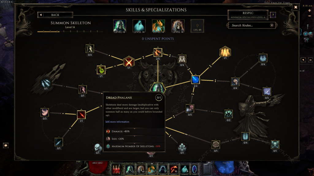 The noble beasts assemble behind my weird linebacker with two axes.The way in which Last Epoch is special among ARPGs is the tack it takes towards its active skills. Each active skill in the game will, upon the game’s full release, have an entire skill tree that you can level up and put points into in order to refine and change what the skill does. For instance, here’s the tree for Summon Skeleton, the basic Acolyte (again, Necromancer) summoning ability. You earn XP in this skill tree by killing enemies; you don’t have to actually use the skill to kill the enemies to gain XP, but you don’t appear to gain much from XP awarded from quests. There are four branches here: three for three different kinds of Skeletons you can summon (Rogues, Warriors, and Archers), and one for what happens when a Skeleton dies. There are three nodes on the tree that increase your maximum number of Skeletons allowed at once, and both the Archer and Warrior path have a capstone ability that disables the summoning of the other. This is a common, reinforced thing across many of the skill trees for abilities: they’re about specialization. There are almost always tradeoffs to be made over the course of making a skill stronger -- and of course, the mere act of investing in any specific path on one of these skill trees is itself a tradeoff, since you have a maximum of 20 levels to earn and spend, and each advancement has an opportunity cost.