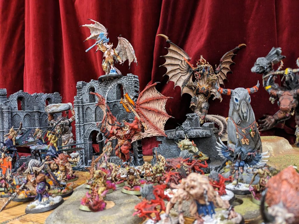 Burning Skies. Credit: Beasts of Chaos, Khorne, Slaves to Darkness by dw_mini_painting, Archaon by monsterpainter80, Maggotkin by josh_saelfeIf it is possible to point to one moment that clearly marks the end of the Age of Myth and the beginning of the Age of Chaos, then it is the Battle of the Burning Skies, which takes place in Aqshy. Things are by no means going well for Sigmar’s pantheon at this point, but Chaos hasn’t won yet. Wherever Sigmar fights, the ruinous forces are driven back.