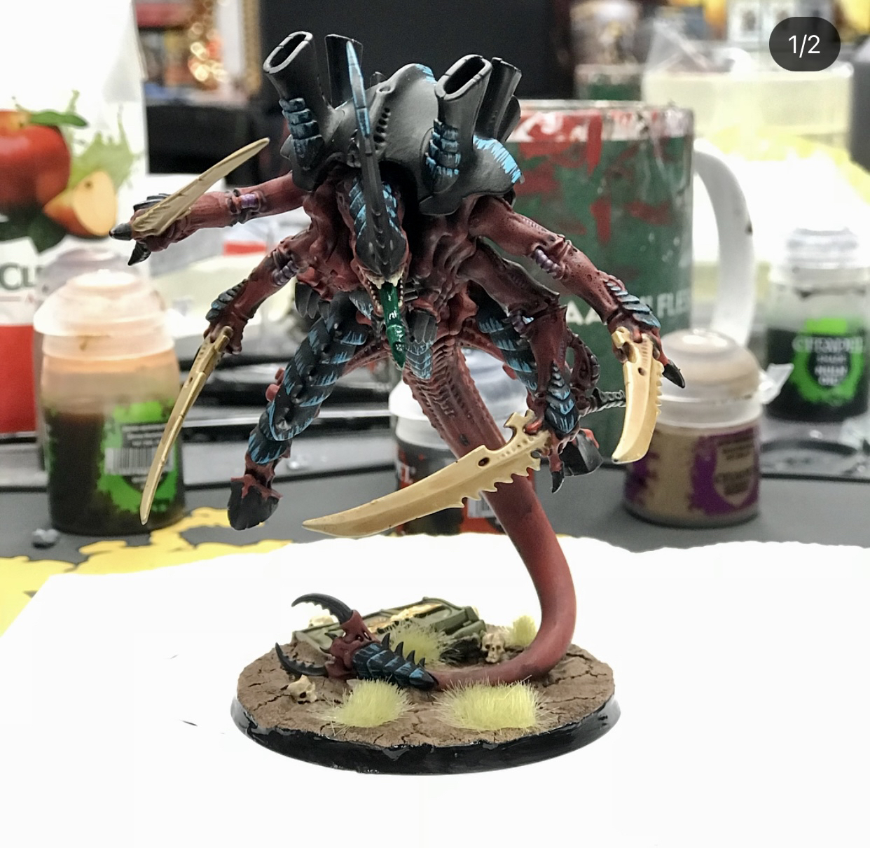 Hive Fleet Tiamet canonically have light blue-green flesh with darker teal armor plating and are known for being adapted to defensive warfare. Specifically, they’re known for having diamond-hard chitinous shells and highly regenerative flesh and attacking in overlapping waves capable of withstanding tremendous firepower. They’re named for the Tiamet system where they were discovered, and it’s in the center of this system where they’re building some kind of massive biostructure that seems to be broadcasting a psychic scream with greater and greater intensity.Ouroboris