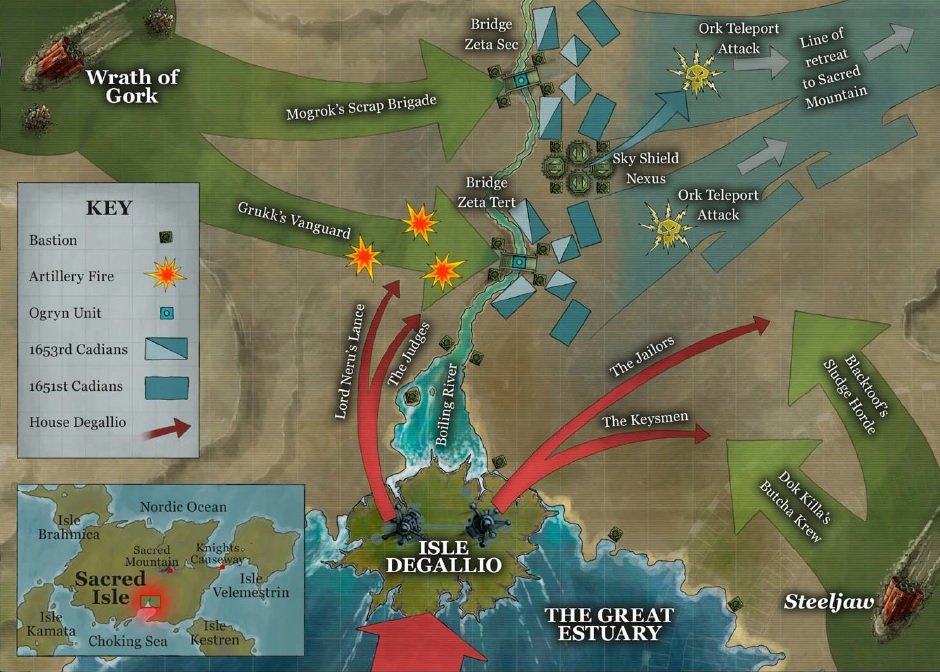 Running south to the Great Estuary of Alaric Prime's largest continent is the Boiling River, a river of toxic, bubbling chemicals that can burn the skin off anyone foolish enough to take a dip. As the Imperial forces fell back, Castellan Stein's plan was now to use the river and its bridge as a bottleneck, slowing the Ork advance while shelling them with artillery to buy time for an ordered withdrawal. This went smoothly at first, and Ork bodies piled up on the riverbanks until the Orks attempted to swim across, dying in the process or being slowed to where they could be easily picked off. Grukk's arrival on the battlefield once again changed things, as he personally smashed through the Ogryns on the bridge while his Weirdboyz teleported units across the river and directly into the Imperial lines. Only timely intervention from the nights of House Degallio saved the day, giving the Cadians and their Militarum Tempestus Regiments time to regroup as the Orks were finally rebuffed.Isle Degallio