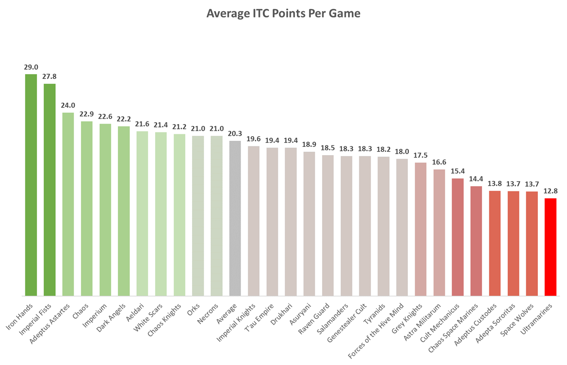 If we look at ITC Points scored within the games themselves, we can immediately see two points. First, that Space Marines are now a dominant force. Second, even among Space Marines Iron Hands stand out as a clearly superior option. Ultramarines surprisingly scored the fewest points per game, though that may be an outlier due to the low total number of lists. Ultramarines barely made the cut with 5 total lists in our sample. At 29 points per game on average, Iron Hands far outperformed the field.