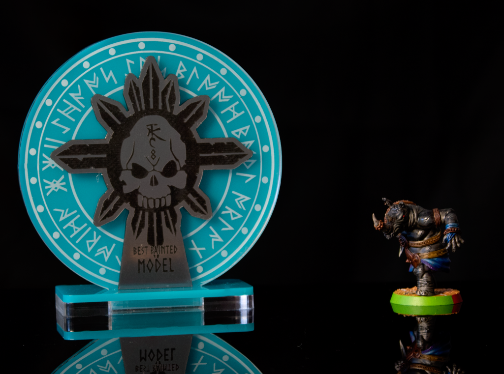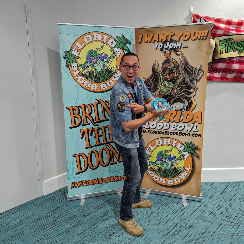 Repping the GBBLN (Georgia Blood Bowl League North). Credit: James LuftI pulled off the Most Touchdowns award! Josh, my Skaven opponent in Round 4, scored one more than me, but finished in 2nd place overall. This tournament spread the wealth, meaning no coach could win two gameplay awards. Painting awards, on the other hand…