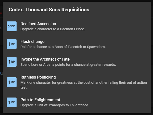 First off, there are Requisitions - we went ahead and implemented these for every faction in the game. This is about the easiest thing for us to do and while they mostly don't do anything except decrement your Command Points, they will do that correctly and you'll have a record that you used them, which is the first step on the road to having the content for these done.