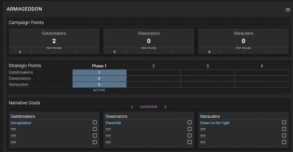 More updates! We're planning to add support for Black Templars in the next week - it's done but hasn't been tested in our backend yet. We expect it to be ready to launch this week. We're also hard at work finishing the Armageddon update, and that should hopefully go live in the next week, along with support for quests for Imperial Knights. We're also going to be looking at bugfixes and removing the hard cap on giving a unit with 71+ XP another battle trait, to make those Requisitions work properly.After that, our goal is to get the core mechanics for Death Guard, Thousand Sons, and Drukhari implemented, then we'll come back and flesh out and finish the remaining add-ons and tackle the complicated mess in the Imperial Agents book. With any luck, we should have all of it implemented by year's end.