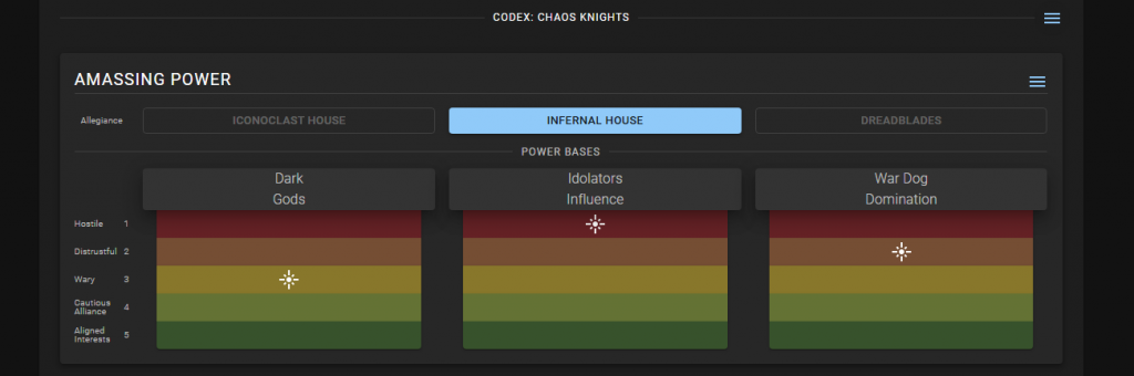 This one also needs work - we have some cool ideas for the chassis upgrades - but for now we've added a tracker for amassing power for your household. Track your influence among the Dark Gods, Idolators, and War Dogs as you brutally subjugate your foes and teach them the meaning of fear.