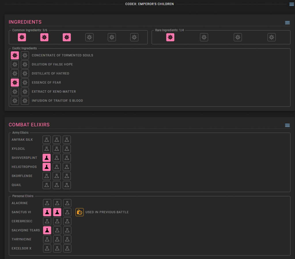 The Emperor's Children are all about collecting creepy ingredients and using those to concoct powerful elixirs that increase their prowess in battle and also probably give them some insane highs. The new add-on for Emperor's Children lets you manage your ingredients and elixirs and use them in battle. Mixing new elixirs and making ingredients hasn't been fully implemented yet, but manually adjusting your ingredients and elixirs means you can manually track those changes for now.