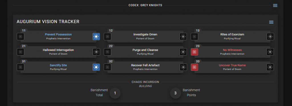 Your secretive daemon-hunting forcers are now able to play their infernal games of Tic-tac-toe with the denizens of the warp. We've implemented pretty much all of the Grey Knights rules, though we have a tiny bit of work left to do connecting some of the Requisitions to this - but you can manually adjust the board as you see fit.What's Next