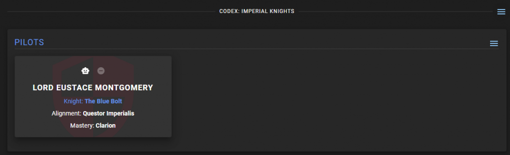 We haven't implemented Quests yet - those will be coming in the next week or so - but we've implemented pilot tracking for Imperial Knights, complete with the ability to track your upgrades and burdens.