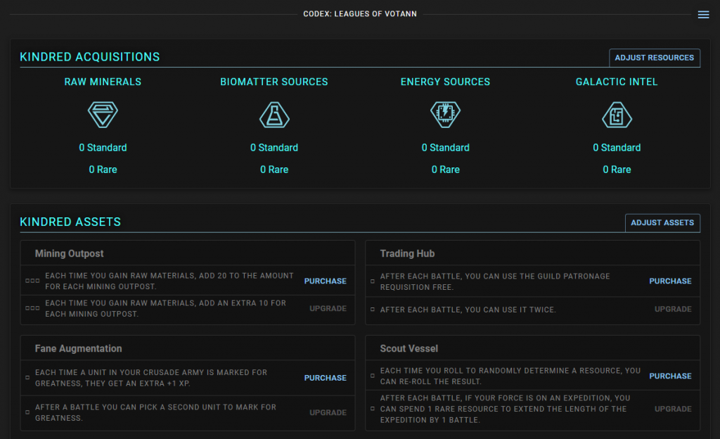 Votann were already in Administratum thanks to our having implemented the Leagues of Votann White Dwarf rules last year, but those rules were replaced by the new codex, and were now wrong. So we've updated those to reflect the new codex. Track Kindred resources, purchase assets and upgrades, and work your way across the galaxy.