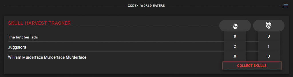 This one still needs some work, but the bones are there - it'll add skull and legendary skull trackers to each World Eaters unit on your roster, and you can track the skulls for every unit in your roster from your Roster dashboard.