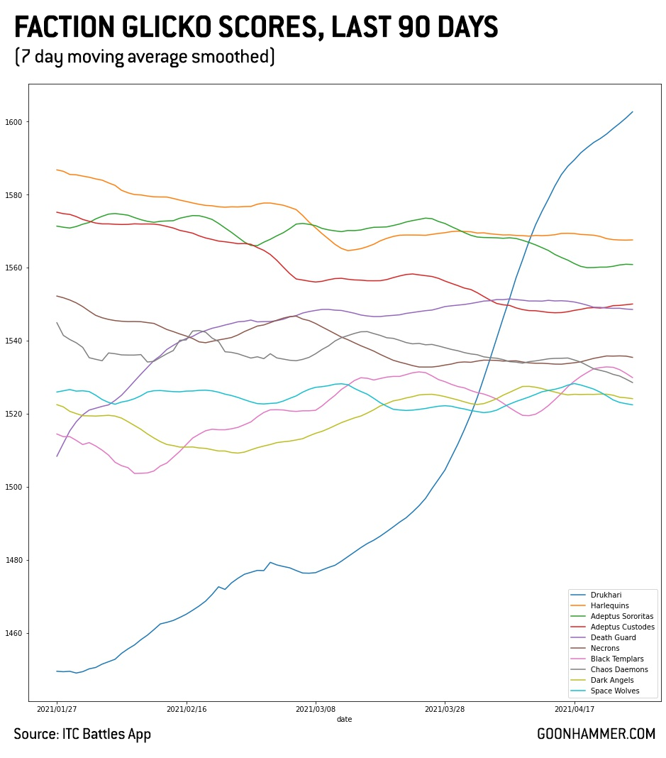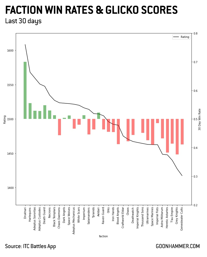 Credit: DexefiendRob: At this point, whether you look at win rate or the ELO-like Glicko scores, Drukhari are as far ahead of the next best factions - Sisters of Battle and Harlequins - as those factions are ahead of Genestealer Cults and Tau, the game’s worst factions. Drukhari won a whopping 71% of their recorded ITC Battles App games in April, 15 points more than Harlequins, the next-highest faction. Excluding mirror match games, Drukhari players won more than 79% of the games in which they had the first turn, and won more than 66% of the games in which they went second.