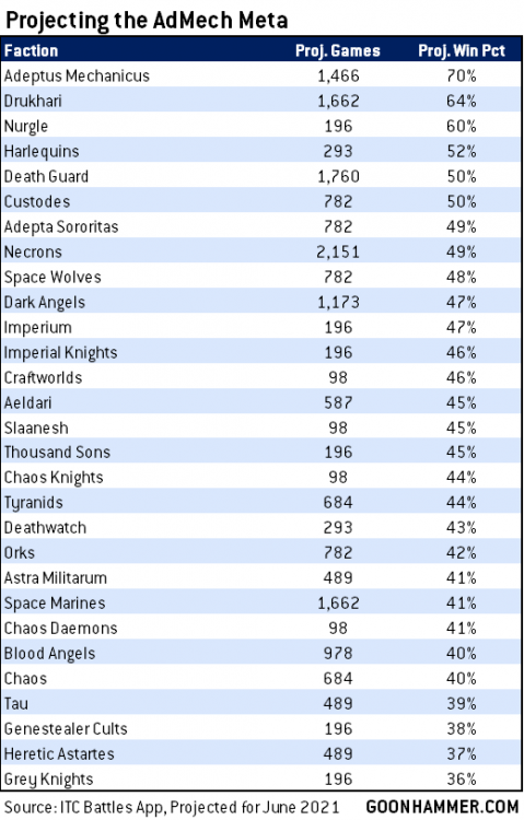 This projection has AdMech doubling in size as a faction in terms of games played (something we’ve seen happen with past codexes), Drukhari are pushed down to a 64% win rate based on losing 70% of their games to AdMech, and everyone else drops by a little bit, leaving us with four factions that post win rates above 50%. If Codex; Sisters of Battle does the same thing, we end up with a similar situation, pushing out Harlequins from the “above .500 club.” And likewise for Orks if it’s on the same level, creating a meta where the four most recent factions have 60%+ win rates and the rest are sub-50%. Now you may suggest that many factions have yet to receive 9th edition updates, so they’ll be fine - but note that as this happens, Marines, Necrons, and Death Guard will be left far behind.