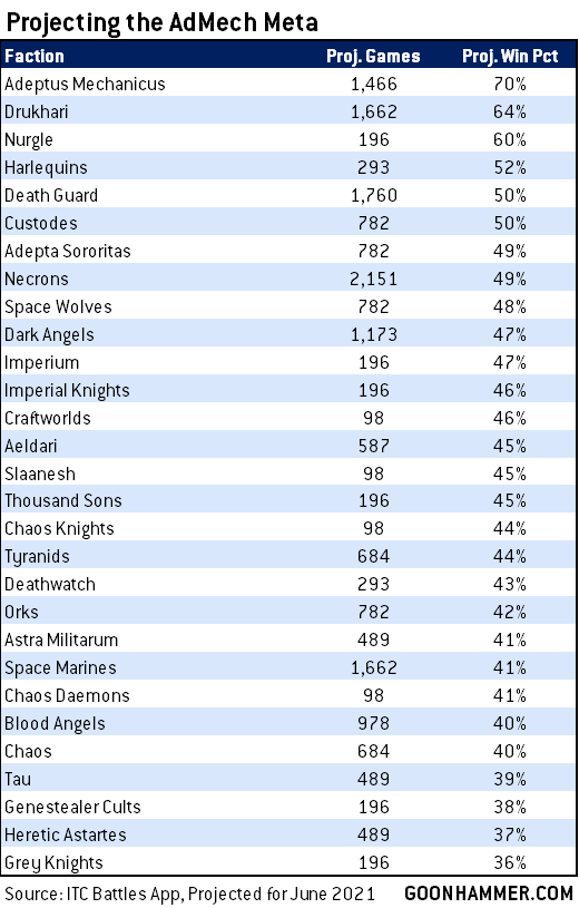 So let’s assume a new Adeptus Mechanicus codex comes out that’s on the same level, power-wise, as Codex: Drukhari, but able to consistently beat them. We know from past analyses that a new book leads to an increase in share of games for a faction, and we can also project increases in games based on last year’s data, which showed an increase of games prior to COVID-related shutdowns. The resulting meta looks something like this: