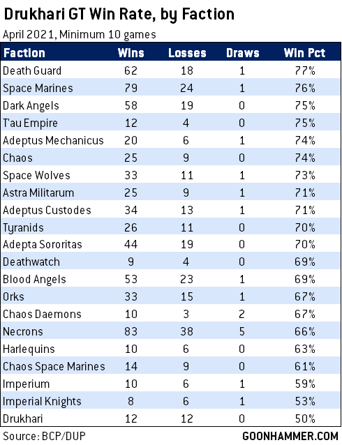 From a head-to-head standpoint, there’s no faction that wins even 50% of its games against Drukhari in either the ITC Battles data from April nor the at GTs when we consider tournament data from BCP/DUP, and most factions have win rates below 35% against Drukhari.