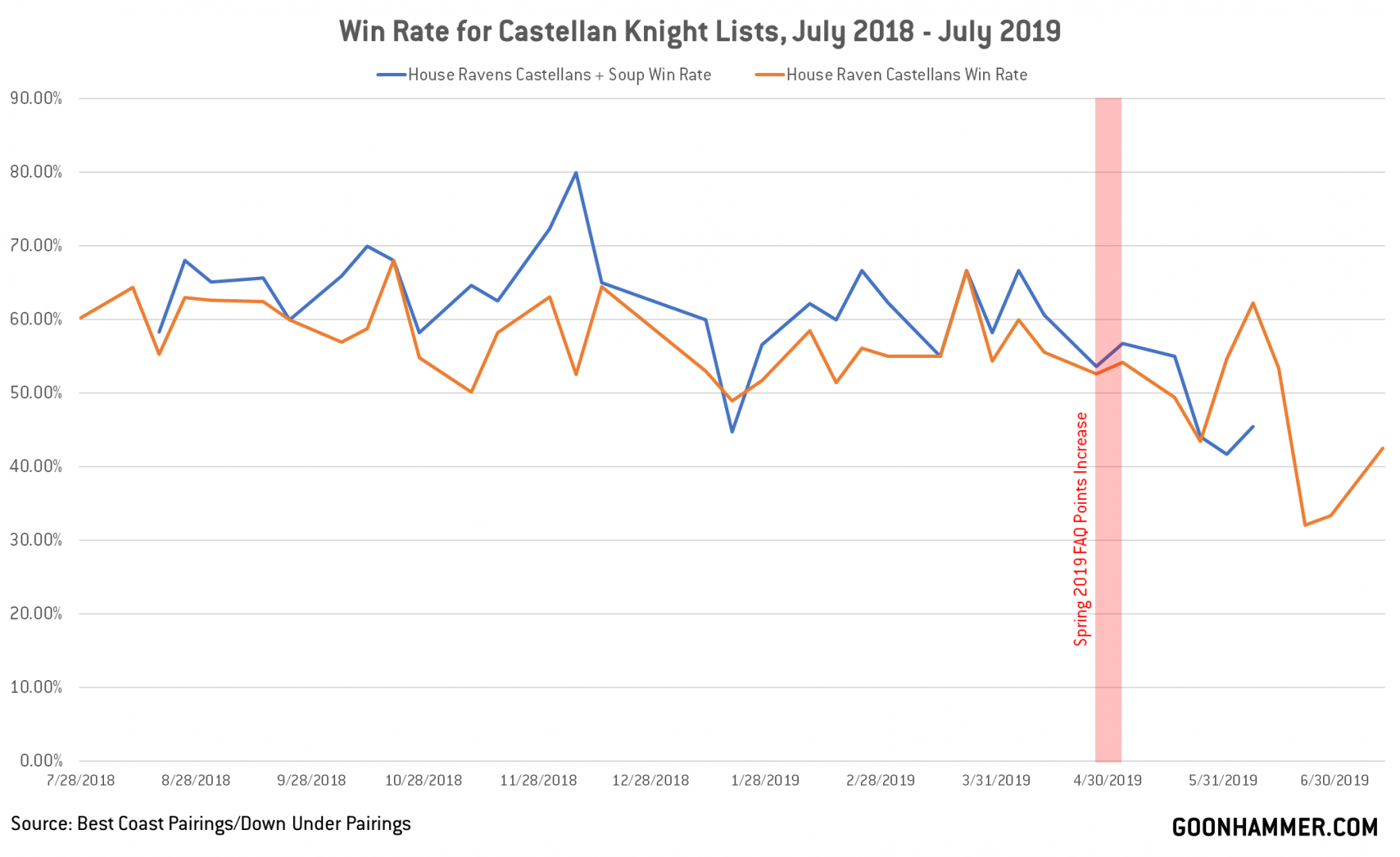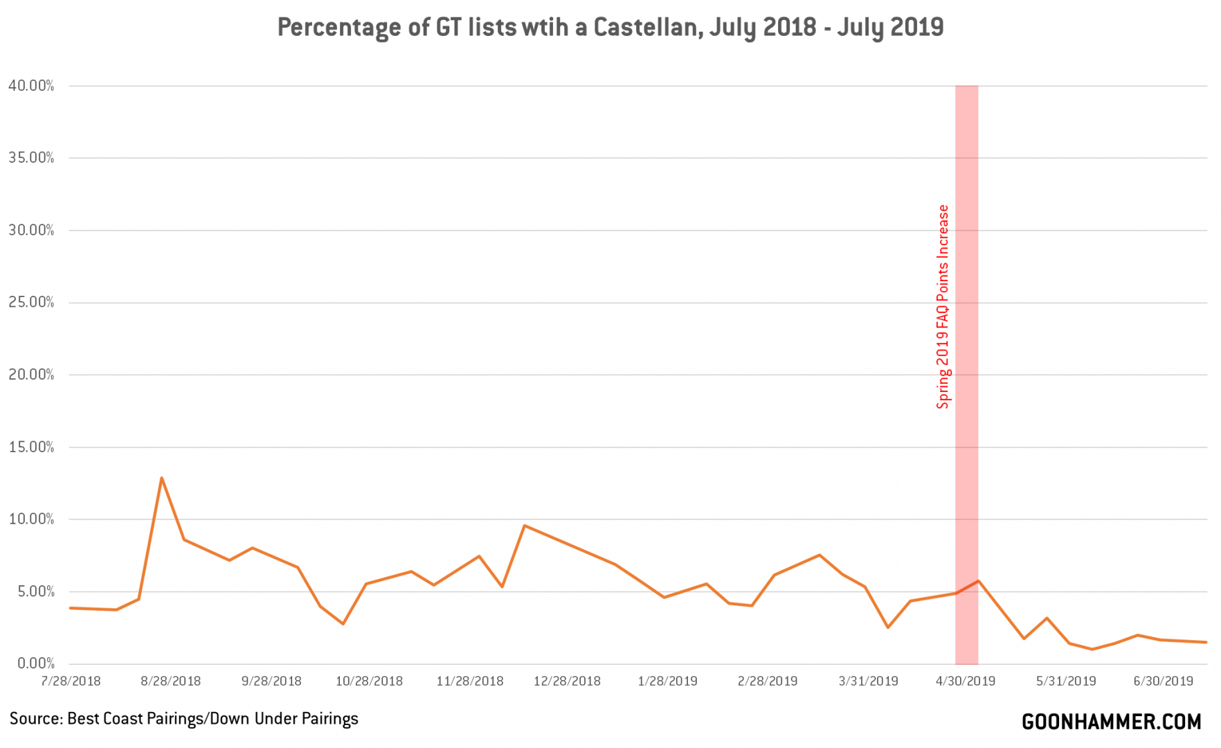 Falcon: When I began collecting data back in July of 2018, we were just beginning to see what would become a great spike in GT and Major play around the world. It just so happened that my start also coincided with the creation of what would become one of, if not THE most meta-defining units of the last 2 editions. In June 2018, codex Imperial Knights dropped and was the talk of the town. People were drawn pretty quickly to House Taranis’ “Zombie” knights, House Raven and House Krast’s firepower and House Terryn’s speed. It would be at BAO 2018, the first Major after their release (and the first event I would cover), that we would see what might be a problem. What would become known as ‘the Mitch Pelham list’ and later just ‘the Castellan list’ would see play for the first time on stream at BAO and despite losing that game it would be clear that it was just the biggest coagulation of degeneracy one could think of.Combining Astra Militarum and Blood Angel command point regeneration (which at the time could stack), Blood Angel Thunder Hammer captains, 9 of the aggressively costed Artemia Pattern Hellhounds and the House Raven Knight Castellan created a list that would start the game with 13 command points and often gun through 27 by the time the game ended with some to spare.