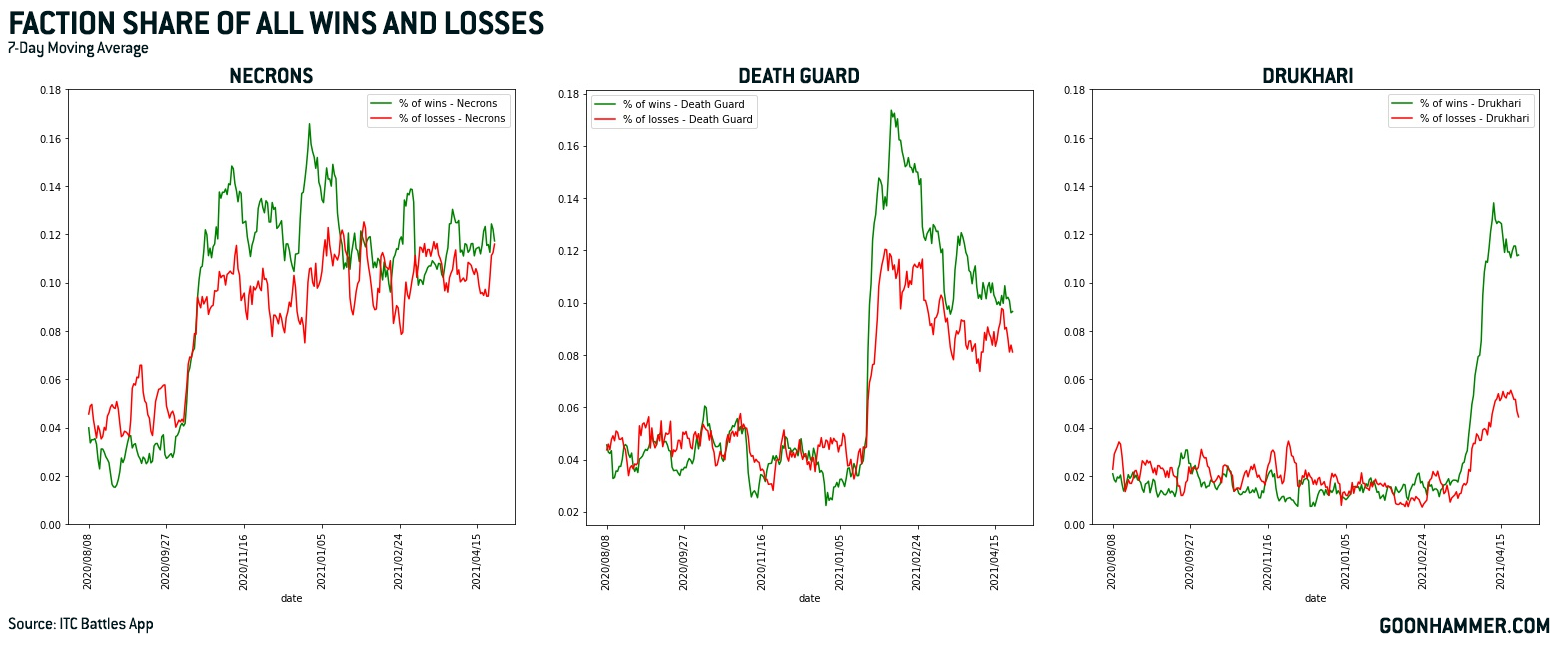 Credit: DexefiendThat said, Drukhari are not the only faction to see their win rates improve as a result of a codex release, though we can see from the chart above that Death Guard's improvement, while significant, was nowhere near the same level. Still, one major impact that we need to consider is that as factions get new books, they become more popular, and take on a number of new players, likely with varying skill levels. We can take this into account by looking at the share of total wins and losses for a faction to get an idea of how a faction's performance scales against its popularity. If we compare this to the changes in win/loss share for the last two major codex releases - Necrons and Death Guard - we can see that while those factions rose in popularity and took a greater share of total wins, they also saw an increase in recorded losses as well. Comparatively, while the share of wins for Drukhari have skyrocketed, there's been only a small increase in the share of losses.