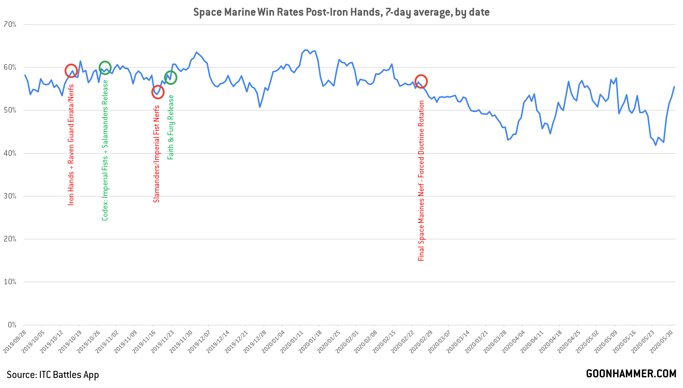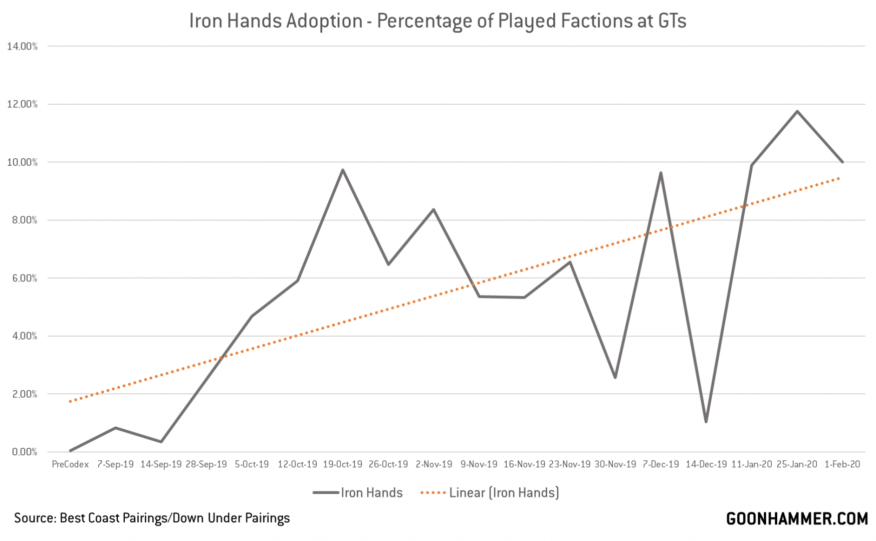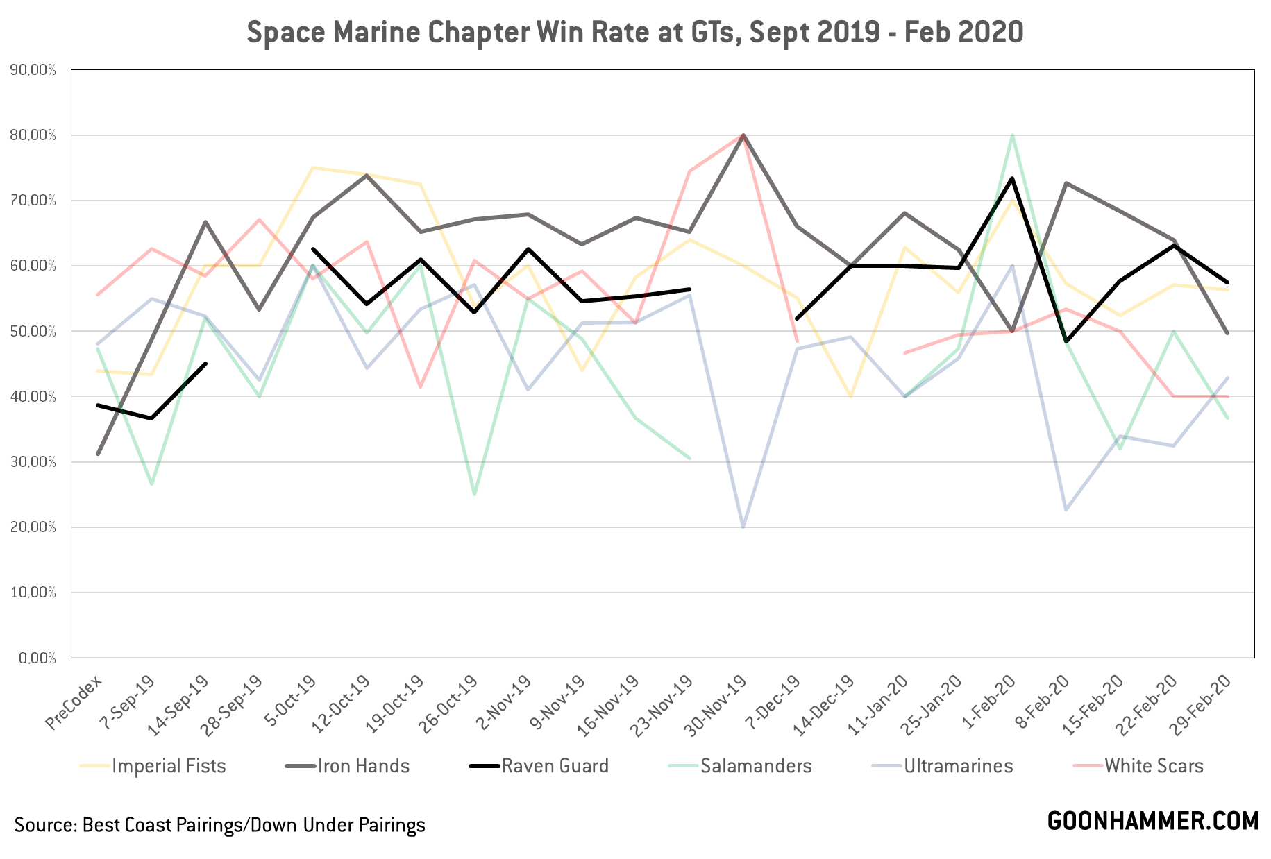 At what point on this chart does the meta "adapt" to Iron Hands?Iron Hands and, to a slightly lesser extent, Raven Guard retained a remarkably stable win rate for nearly six months, dominating events. But why didn’t the meta adapt? Well, there are three key reasons: