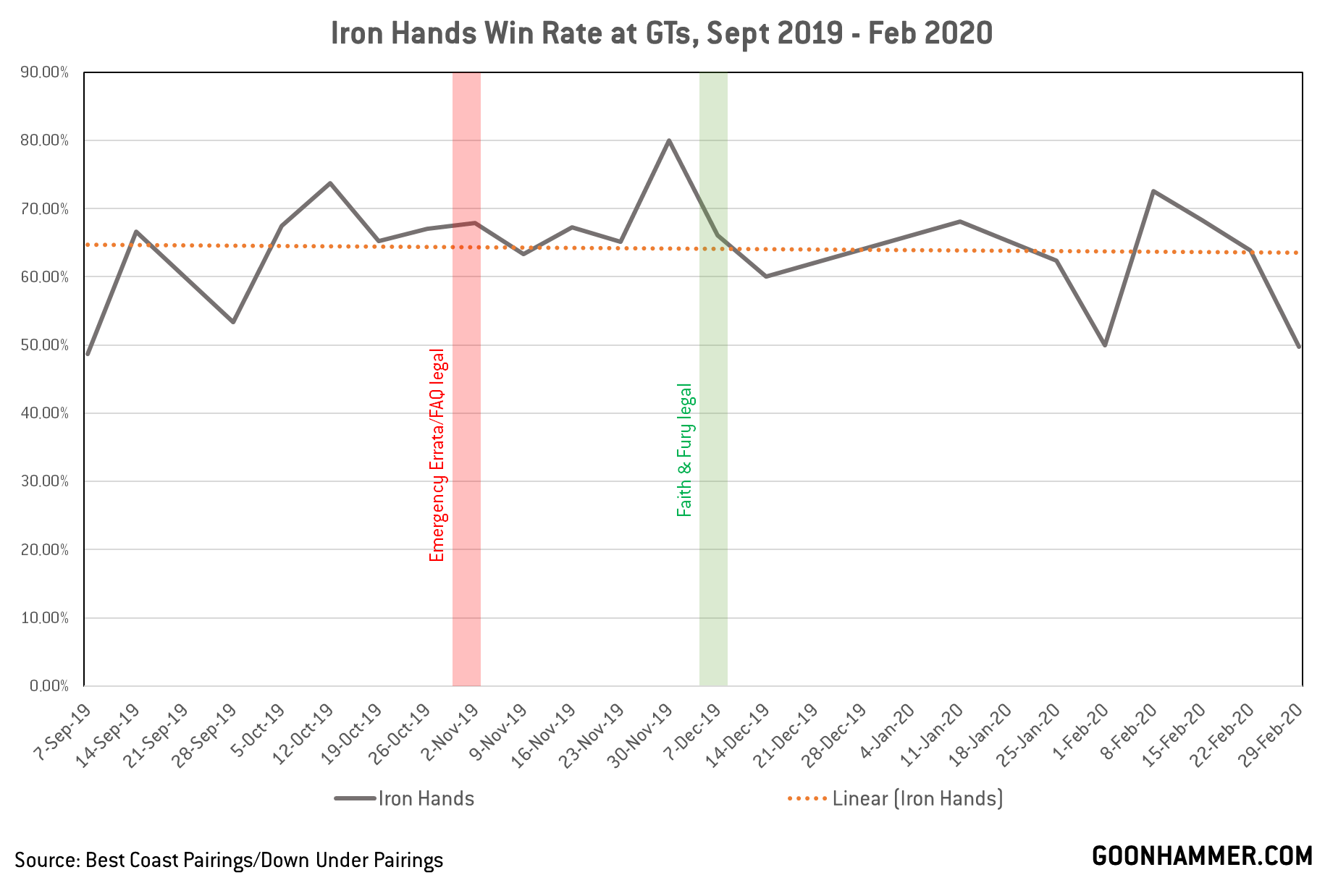 Because obviously they did. “Adapting” isn’t a one-sided process, and when elements of the codex were nerfed in the emergency FAQs and errata or when players attempted to find counters to the list, Iron Hands players adjusted to take advantage of other degenerate strategies to stay on top. The difference is that Iron Hands were already winning 70% of their games in a diverse meta with lots of strategies, and so the chances that a player would create a novel list that would be successful against Iron Hands were slim at best.