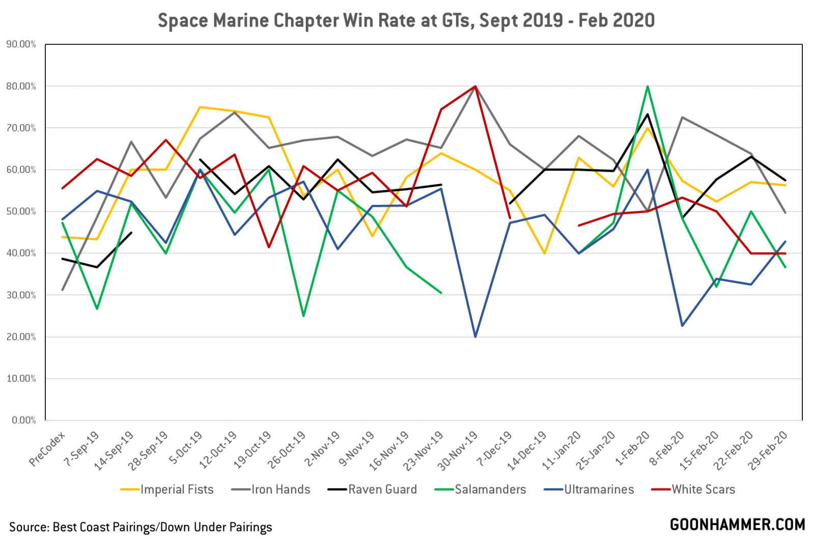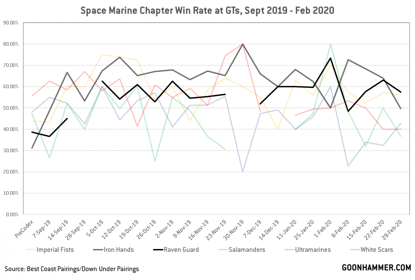 Rob: Although Space Marines were generally pretty good, the breakout success was reserved for Iron Hands and Raven Guard, which represented the majority of successful Marine armies and dominated the events they were in, with Iron Hands reaching the greatest heights and averaging win rates of 65-70% for nearly six months.