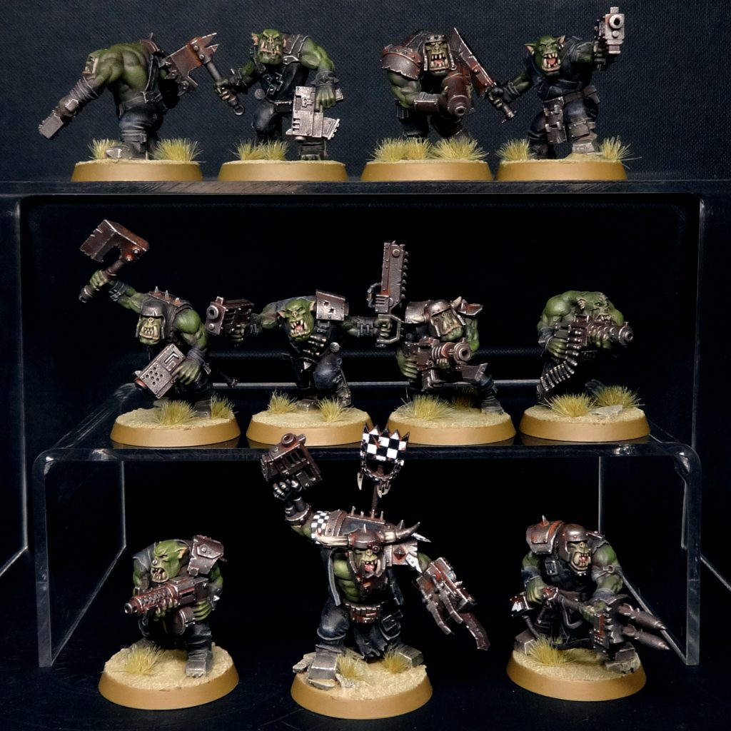 Goff ork boys. Credit: Charlie BrassleyIn the interests of balance, I should say there is one big downside: if you buy more than one box, the repeated poses become very obvious since you can't even do headswaps easily. Every single mini here only goes together one way, with some slightly different options for the rokkit launcha and nob. This wasn't an issue with the old modular kit. If you want to paint multiples of this kit, you might like to engage in some light conversion work. I shaved off certain details, but found this alone was only sufficient to get to 20 Orks. Were I to do more, I think the move would be to hack off the choppas and swap them around, or if you're feeling plush, get a box of the old modular kit - which GW still sells - and swap out the choppas entirely, since the weapons in that old kit have aged well, as have the faces (not that it'd be easy to attach the old heads to these new bodies).