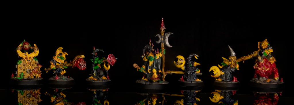 Finally, there's something about Gloomspite Gitz that makes me want to paint them in bright colors, something that's all too rare in the Warhammer world. Inspired by this article on using pink in your miniatures, I chose to go with a bright yellow for their armor, contrasting with deep black robes and red squigs and mushrooms. Last year, our own SRM went with a bright turquoise for his squigs and mushrooms, set off with a beautiful dark pink in the robes. A riot of color looks just as much at home on them just as much as the classic yellow and black of the Bad Moon. Much like Greggle's grots, the Gitz cry out for fun.
