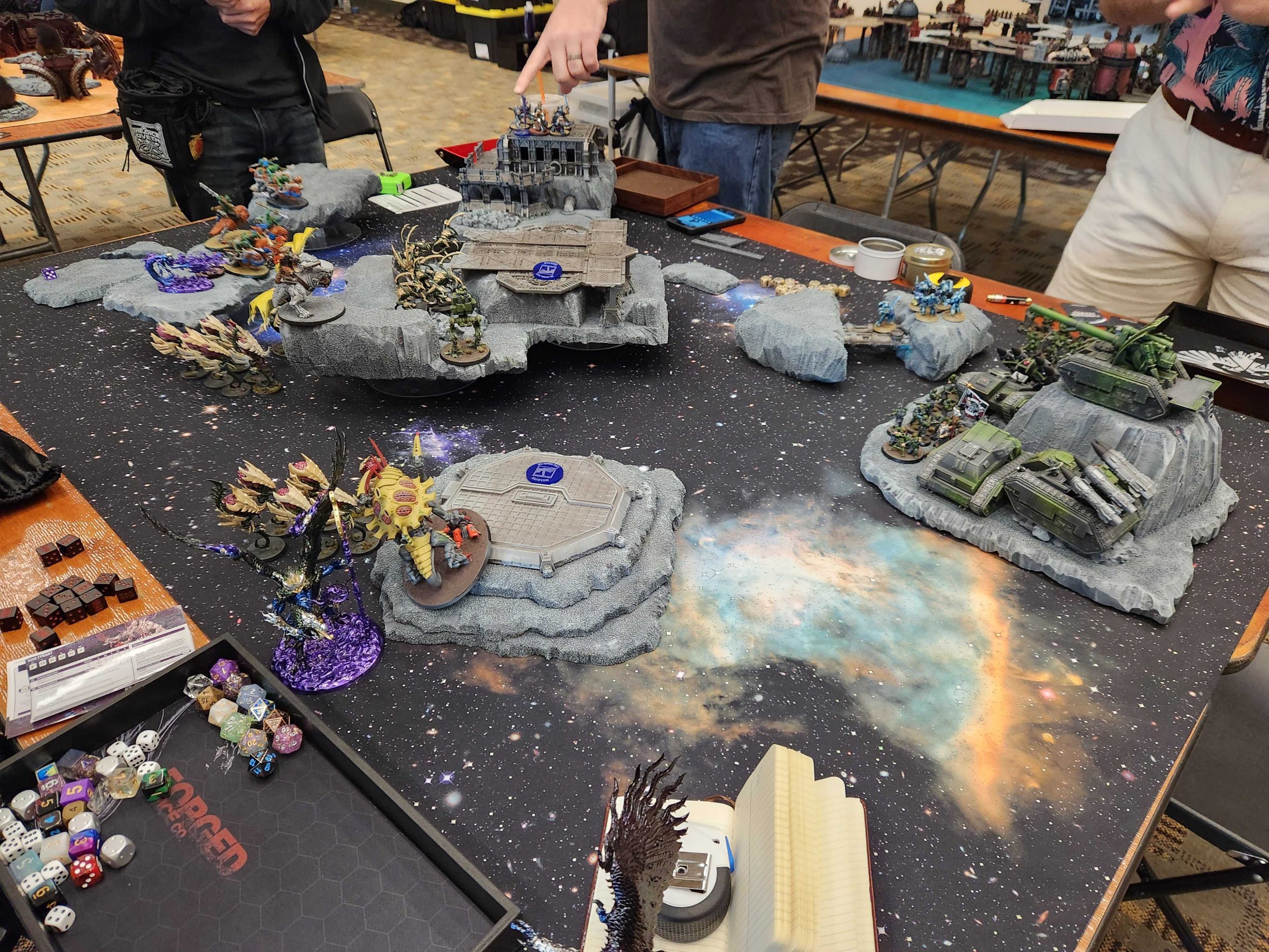 This table features a series of rock platforms for the facility orbiting the planet. The battlefield itself doesn’t change, but has mechanics for jumping from platform to platform, and also has a debris storm mechanic: Every time a unit explodes (via Deadly Demise), players increment a counter. At the start of the third battle round, the storm created by all the explosions whips through the battlefield, doing mortal wounds to everything on the table. Additionally, the team holding the station can drop rocks from orbit onto battlefields below.What Worked: This was by far the best table, and I think people loved it. The table looked great and the mechanics were a lot of fun. This table had the most great moments - stories of a Falcon being destroyed and its passengers all flying out into the void, and entire armies torn apart by the orbiting debris storm made for great moments.