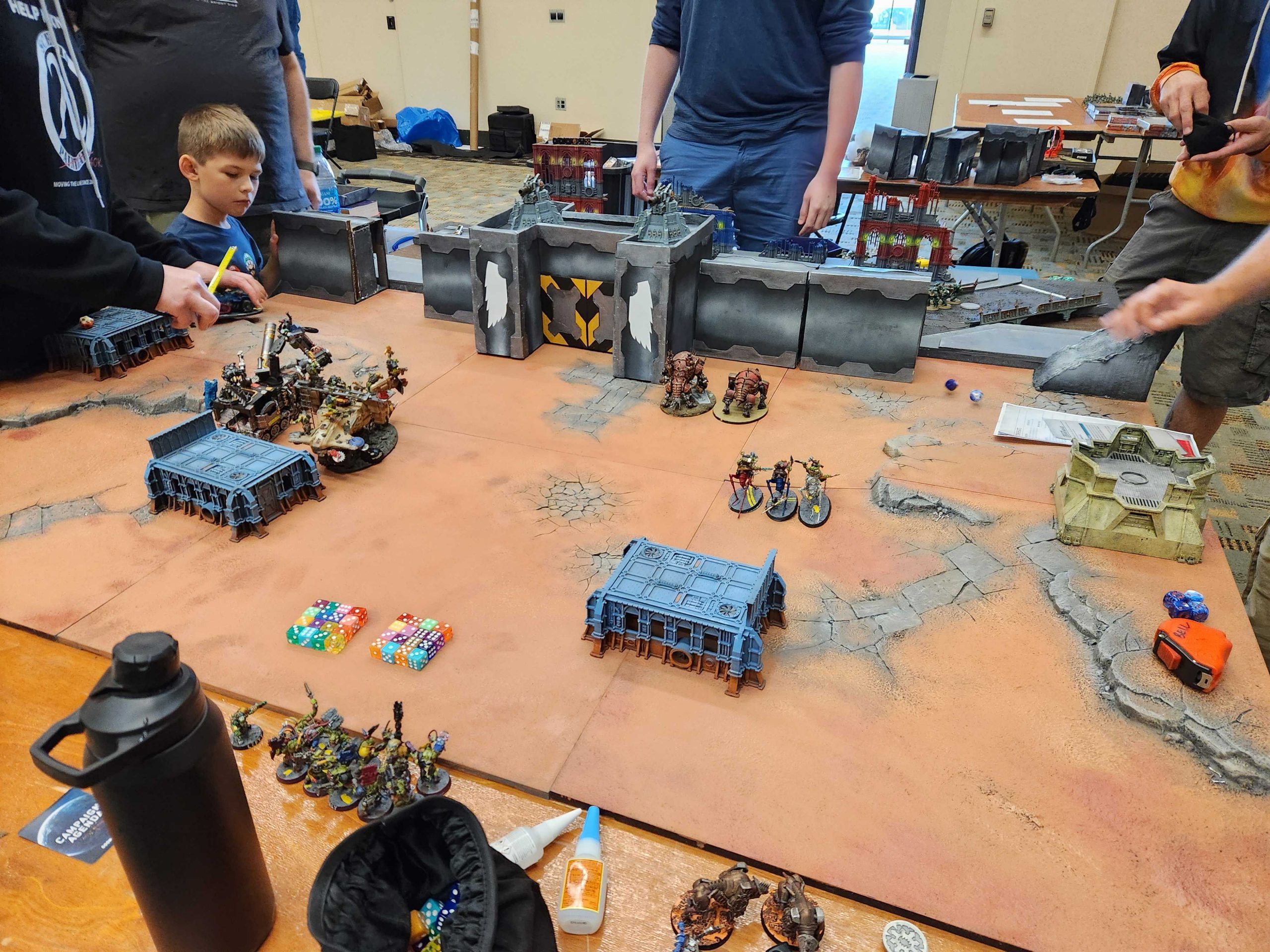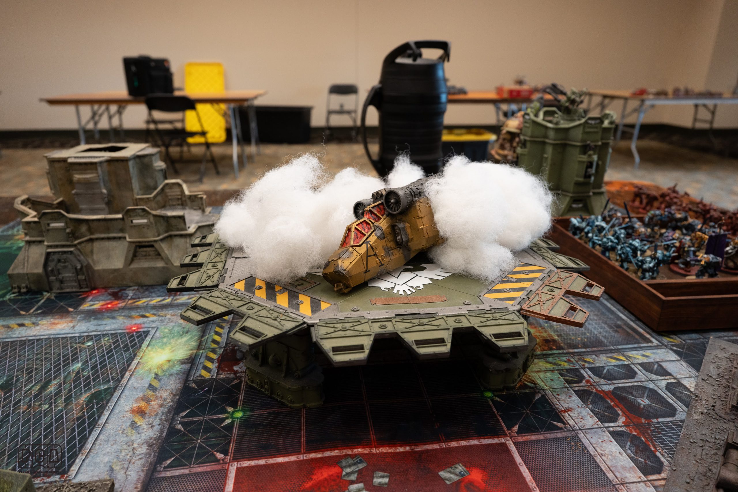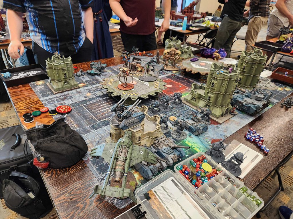 The Manufactorum is split into two parts: the first three games see players attacking convoys on a rolling road mission carrying materiel and security ID tags, which can be captured and used in the second three missions. In those the defenders have automated defenses which attack untagged attackers. Dense smog on the manufactorum table also made it difficult to hit ranged targets.What Worked: The Convoy missions looked cool and were kind of fun. Players were excited to try them out. The Manufactorum table was solid as a table to play on and the mechanics for it were solid, though the defenses were a bit much.