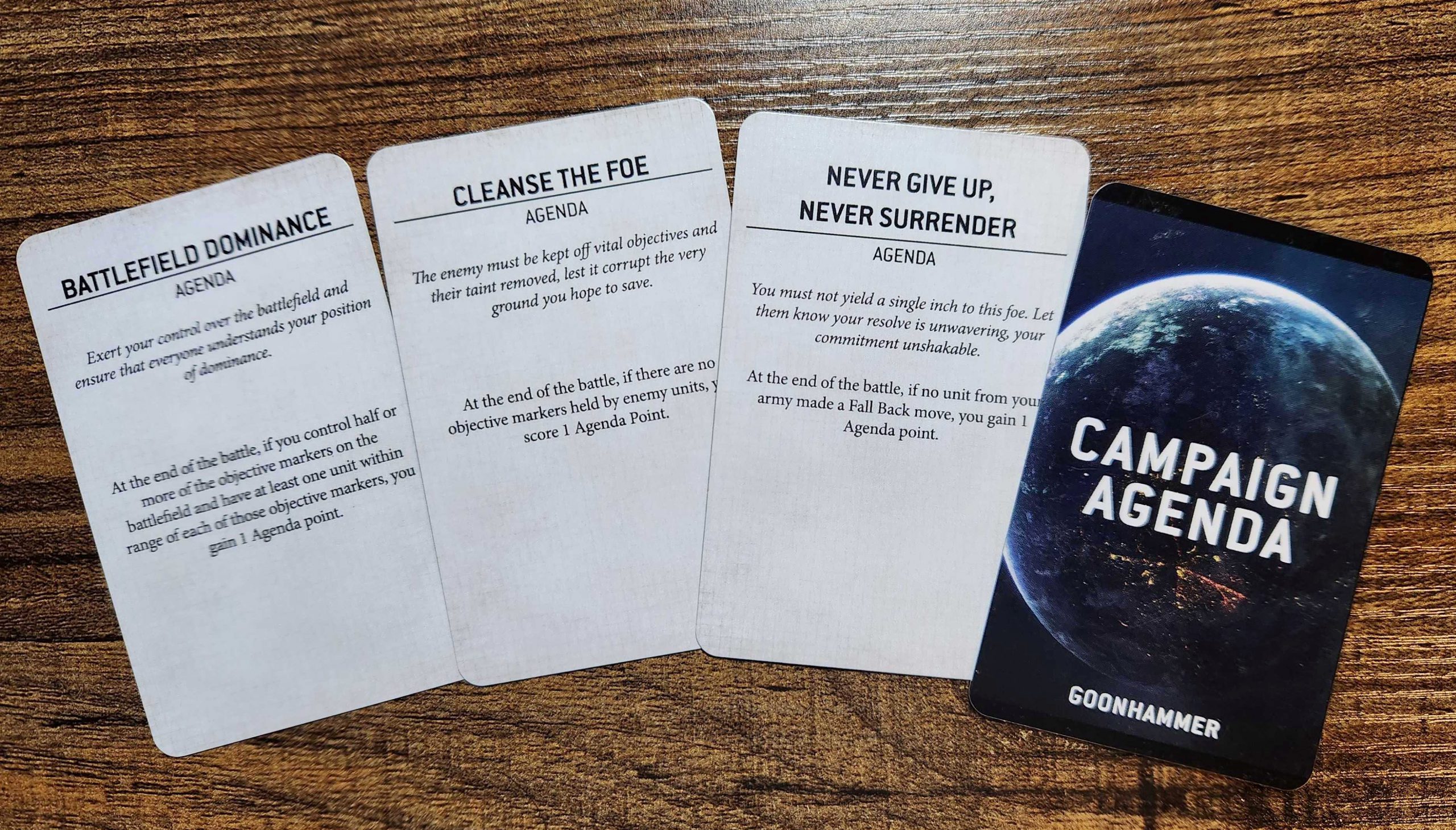 If you're a Goonhammer Patron at the $5 tier and higher - check out our Patreon here - you can access a ton of extra resources from the Goonhammer Open, including the Design Doc we used, image templates for the Agenda cards, and downloadable PDFs and image cards for the campaign's missions and battlefronts. Additional credit and props for developing these resources goes to Norman Greenberg, the other designer on the project, and Andrew Nguyen and Quinn Radich, who have helped on prior narrative events and fall into that #3 player group, and helped refine and finalize some of the content.