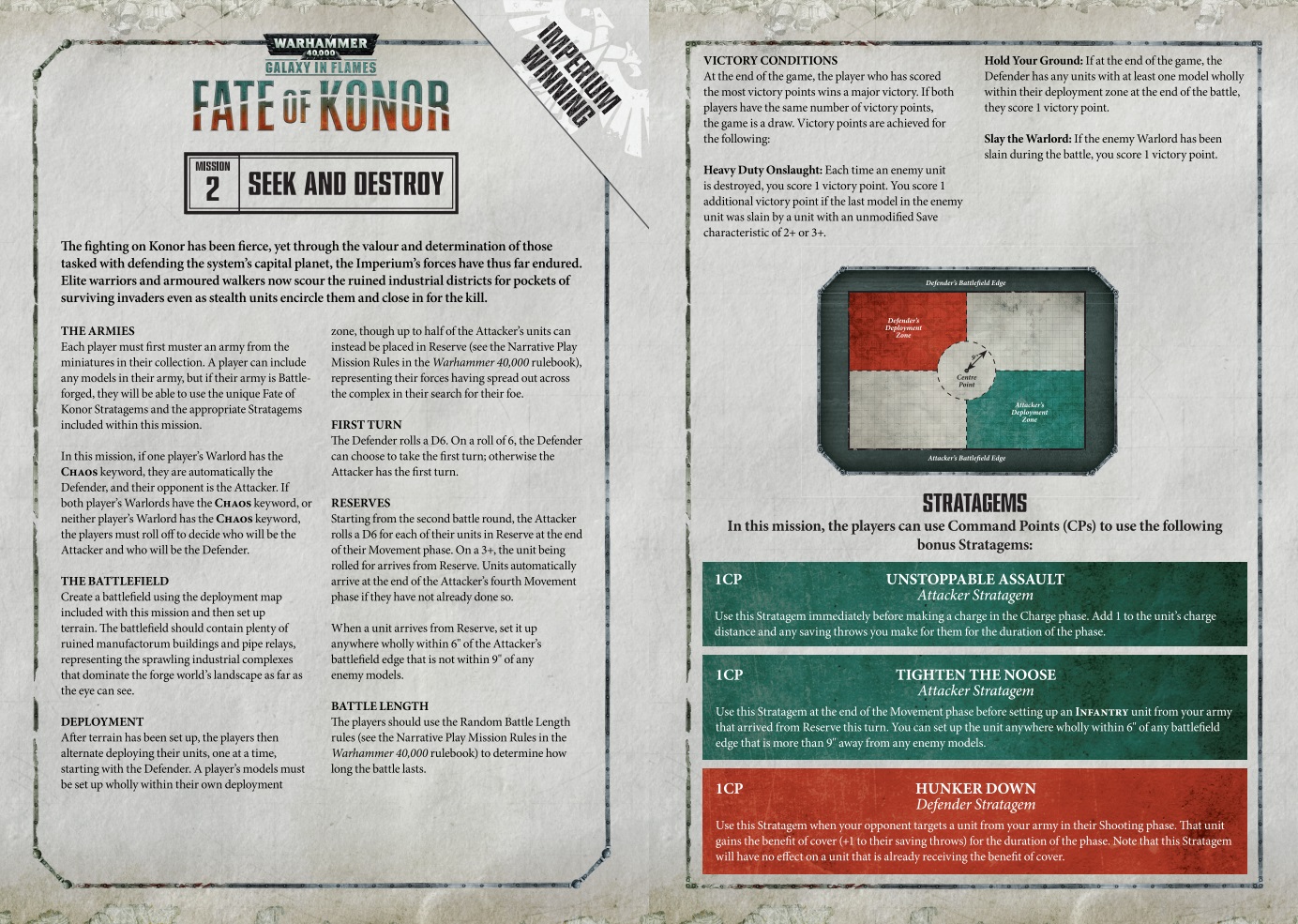 In addition to a new planet to fight over each week, players were also given a custom mission to play and report results against. These missions would have an attacker and a defender, and custom stratagems for each. These weekly battles would also emphasize specific unit types that Games Workshop was trying to encourage players to build and paint, which added a type of slow-grow/escalation element to the campaign. After a player played their game - which had to be at a Games Workshop store - the results were recorded, with specific factions working toward an Imperial victory, and others toward a Chaos victory.