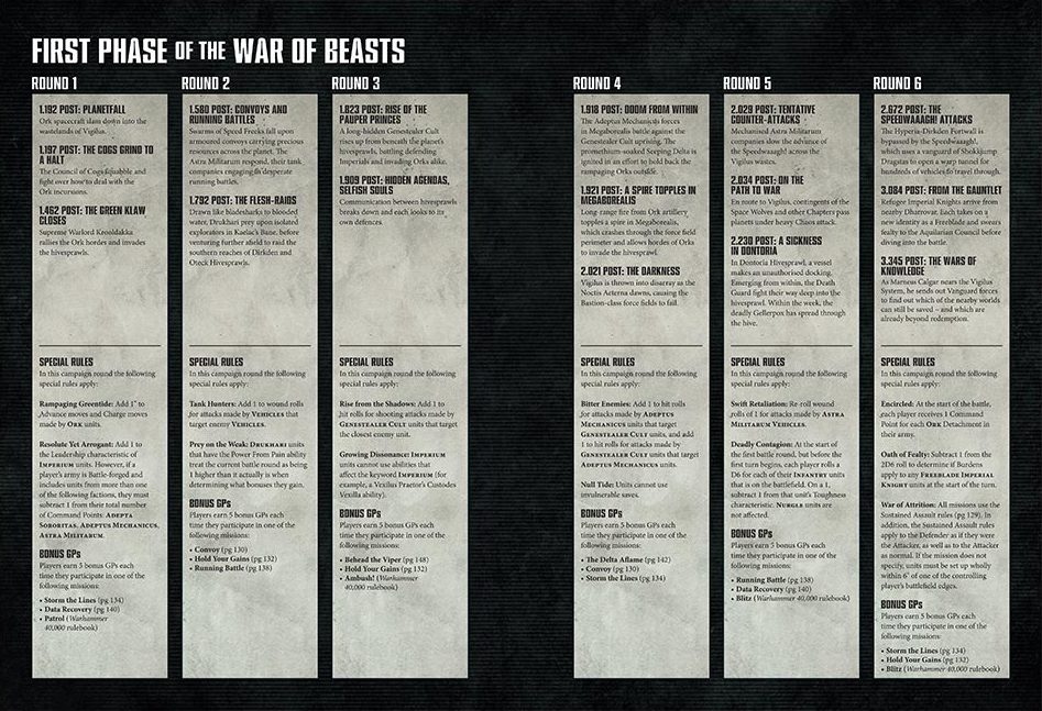 The War of Beasts covers the first half of the Vigilus campaign - basically before Abaddon's forces show up en masse - and comes in three phases. Each phase is split into six rounds, where players from all factions can compete in games to determine a victor - note that these are side-based, so you can play any mission and your victory counts for your side. Each round also has special rules that apply to games played in the round and usually reflect the battlezones, factions involved in the narrative, and the conditions affecting the battle. They also create opportunities for bonus campaign victory points (called "Glory Points") if players play specific missions from the Vigilus book, so missions that reflect where the fighting is most intense and the most important battles are happening.