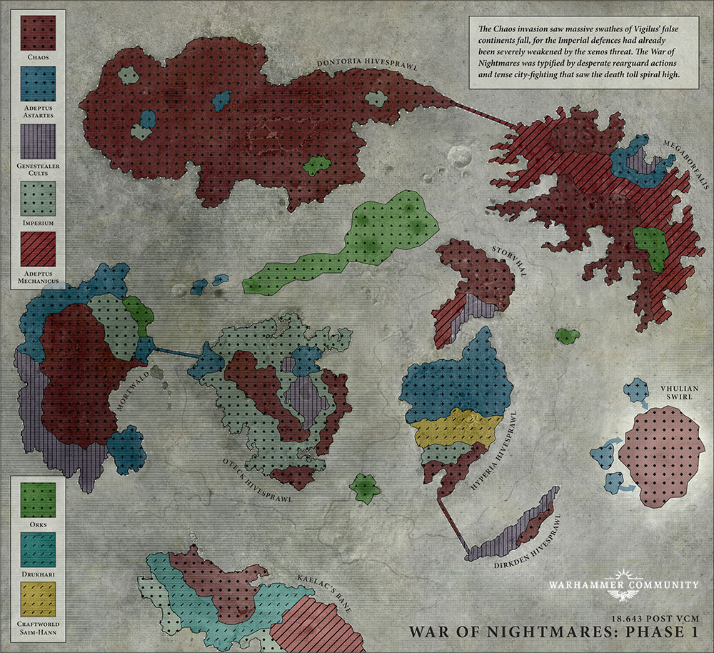 The second half of the Vigilus campaign adds another 3-round campaign called The War of Nightmares, which sees the forces of Chaos starting their massive incursion to the surface of Vigilus. The same mechanics apply this time, with players able to play any games they want each round, but then scoring bonus GPs for taking on specific battlezones and missions that represent key moments and battlefields of import during the campaign. In several places, it also refers back to Vigilus Defiant, which is a neat touch when it needs a specific battlezone.