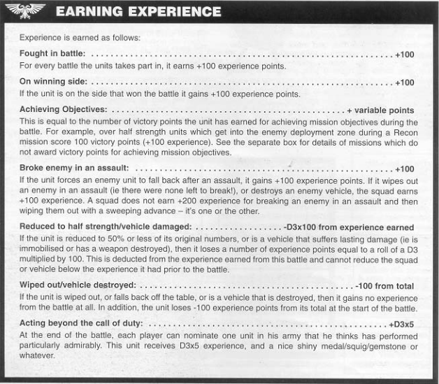 Experience System from the 3rd Edition Warhammer 40,000 rulebook. Credit: Games WorkshopExperience Systems: The Upside