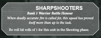 Credit: Games Workshop, Chapter Approved 2018Units that have moved up in their Ranks are rewarded by being allowed to pick Warrior Battle Honours, upgrades that make a unit more powerful. There are 10 unit Battle Honours, (4 rank 1, 3 rank 2, 2 rank 3, 1 each for ranks 4 and 5), and 10 each in similar configurations for Monsters and Vehicles. As abilities, these are all relatively simple, and they range from being nearly worthless (Grizzled lets a unit ignore Leadership modifiers) to insanely strong (Sharpshooters gives a unit the ability to re-roll hit rolls of 1 as a level 1 skill).