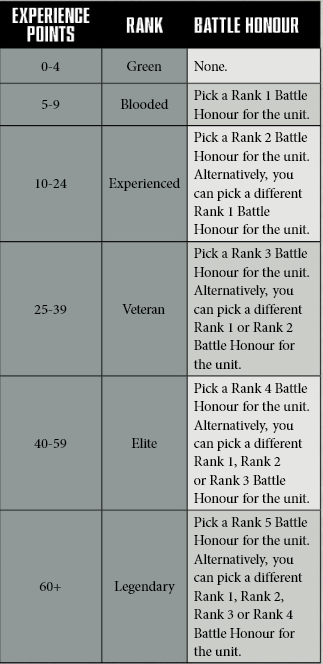 In typical Games Workshop fashion, the Battle Honours rules assume players are using Power Levels for some reason. Units that have gained Battle Honours increase their Power Level by 1 for each Honour they have received. This helps ensure that one player having several high-ranking units will not be coming to the battle with a significant advantage. Note that generally, 1 Power Level = About 20 points, so if you want to use points like all the cool kids, that's the conversion rate.