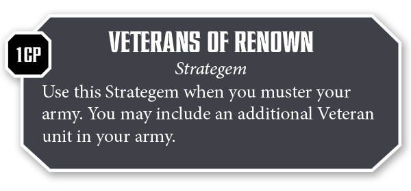 These are smaller than "full re-rolls of 1 for a squad" and adding 1 to wound rolls, but are still nice to have and help describe how a unit might act. In terms of Unit Tracking, I'd have players submit their units to me to keep track of in a public spreadsheet (Google Sheets, probably). This also allows me to vet them to help avoid any particularly rough combinations I might miss. I'd likely avoid having penalties for Losing a unit in battle, just because that's more bookkeeping no one wants and it helps me avoid games where only one player has a Veteran unit available. In order to help keep things balanced, I'd also keep the units free, but max them out at 1 per army per game. This ensures that each player will have a Veteran unit on the table if they want it, the bonuses aren't so massive that if they don't have one it isn't a major issue, and keeps the counts low. As the campaign goes on, I'd introduce the following Stratagem: