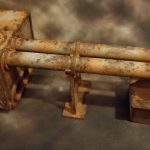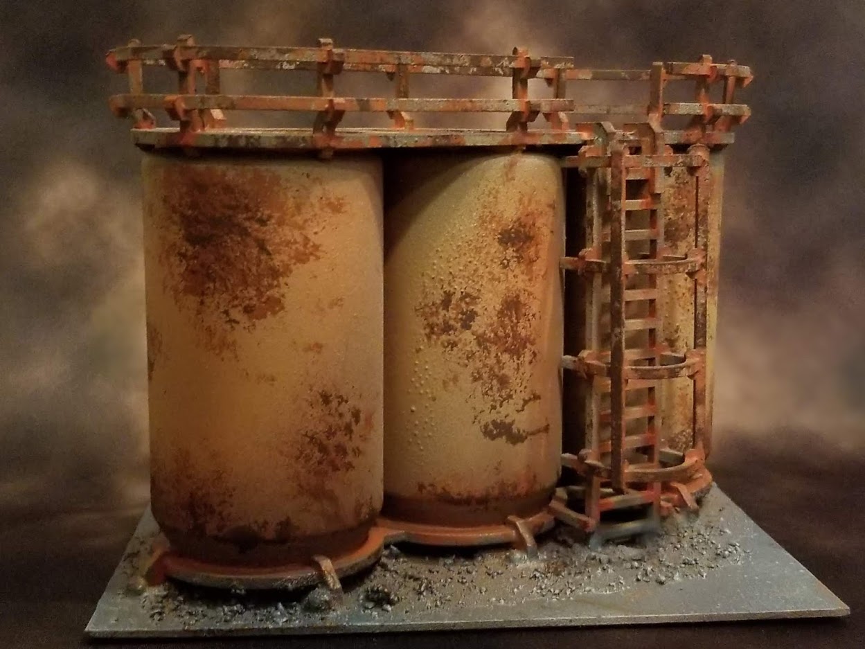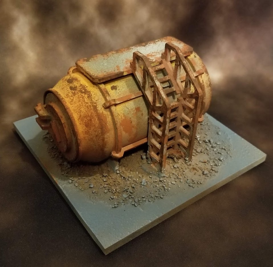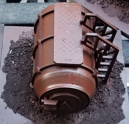 Apply Corrosion: Using watered down orange paint (at least 4:1 water-to-paint ratio), I applied orange to the recesses of the model. This is optional and was the most time-consuming, but worth it. Try to apply the paint where you'd expect rainwater to fall. Corners, ladder rungs, the bottom of entrances, etc. See the orange bits of this photo as an example: