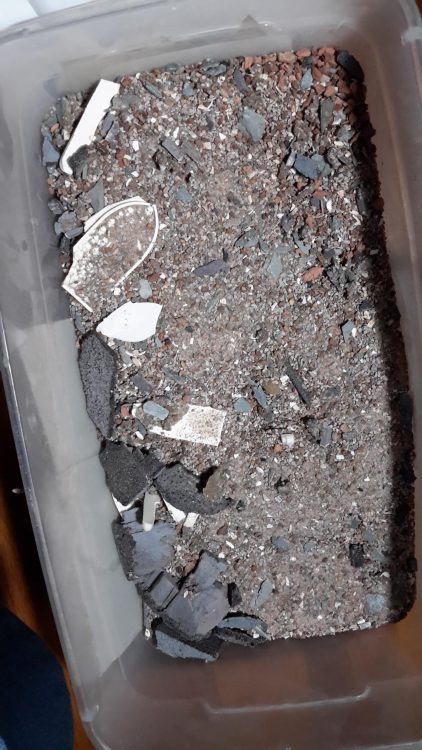 Optional: Flock the base of your terrain. You can use a combination of sand, gravel, kitty litter, bird litter or even the contents of a teabag! Since we’re going for an urban feel, we don’t need to flock the entire base. I flocked around the terrain and left the edges of the board alone. This is also a good time to add some extra bits to your bases to add character.