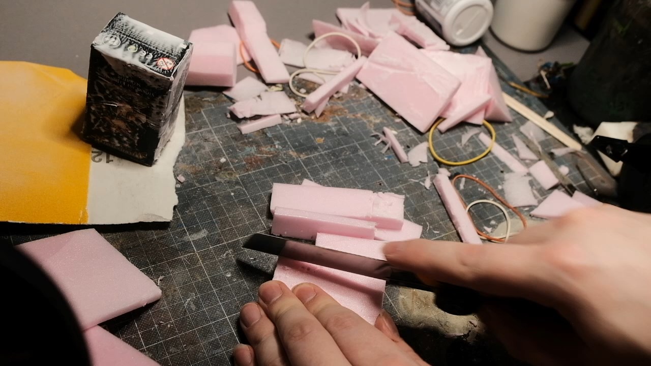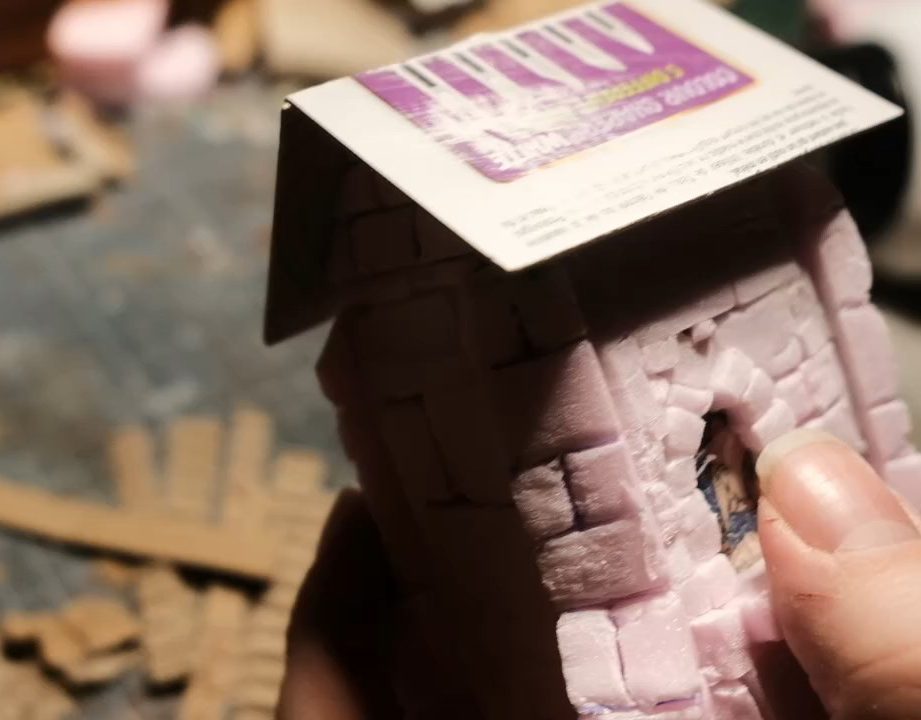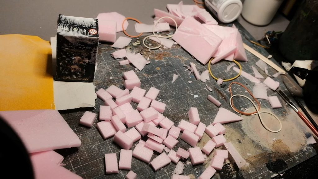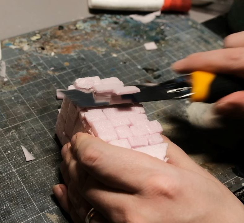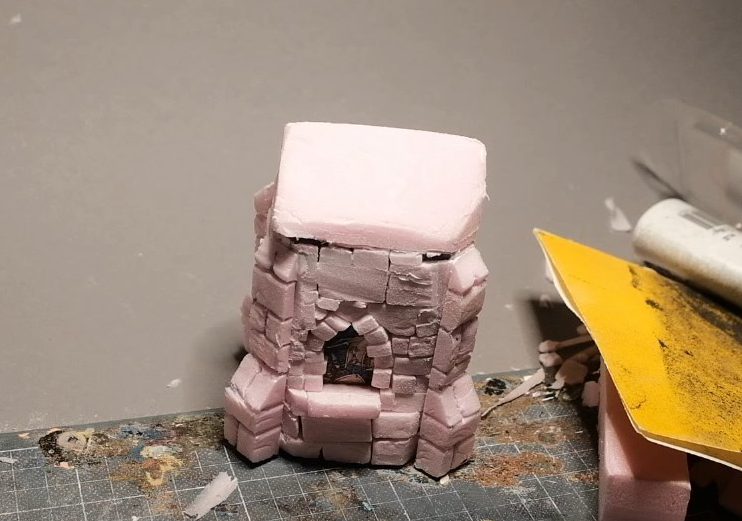 With the building ready to receive them, I then began cutting the pillars themselves out of the XPS foam with my trusty blade, cutting out lengths of equal widths and with lengths equal to the height of the shrine.