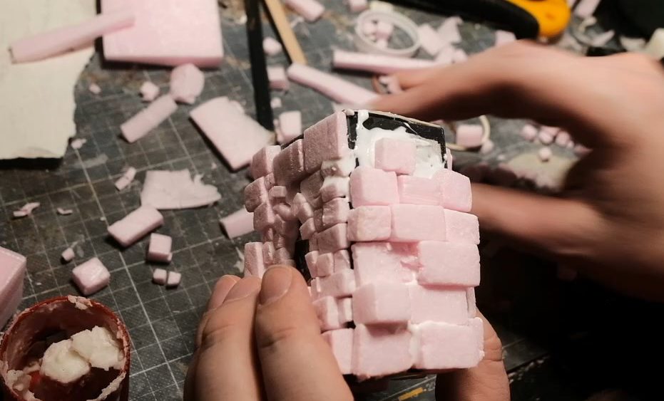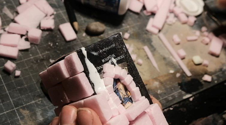 First things first, after selecting a box of the appropriate size as the skeleton of the build (in this case the box from one of those GW miniature of the month thingies) I sliced some XPS foam into lengths of a roughly equal width, and then cut those lengths into very varied stone bricks of all sorts of sizes, from very very large to teeny tiny.